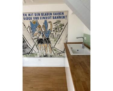 Ein herausragendes Highlight dieser Wohnung sind die vier originalen Wandkunstwerke der Jungen Pioniere, die aufwendig restauriert und stilvoll in das Wohnkonzept integriert wurden. Diese kunstvollen Elemente verleihen der Wohnung nicht nur eine einzigartige Ästhetik, sondern erzählen auch ein Stück Zeitgeschichte.