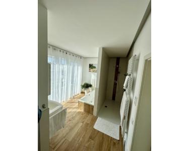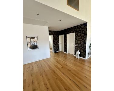 Die großzügige Wohnfläche von etwa 295 m² erstreckt sich über zwei Etagen und bietet ein luxuriöses Ambiente in jeder Hinsicht. Der offene Wohnbereich mit bodentiefen Fenstern schafft eine helle, einladende Atmosphäre und ermöglicht einen malerischen Blick auf den gepflegten Garten. Natürlich darf die Fußbodenheizung nicht fehlen.
