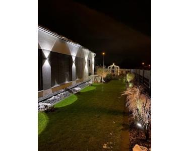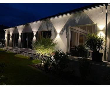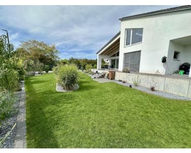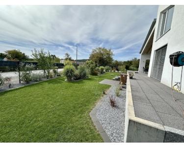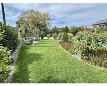 Das Grundstück selbst präsentiert sich als liebevoll gestaltete grüne Oase, die Ruhe und Privatsphäre bietet. Der Garten benötigt nicht viel Aufmerksamkeit, da dieser über eine automatische Bewässerung und Mähroboter verfügt.