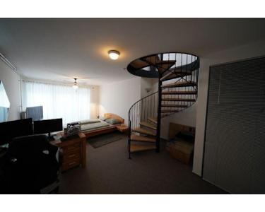 An der Nordseite des Hauses befindet sich die ca. 70 qm große Einliegerwohnung. Sie hat ebenfalls bodentiefe Fenster und ist mit einer kompletten Küche ausgestattet. Vom Eingang gelangen Sie über einen Flur zum Gäste-WC und Wohnzimmer, das eine Treppe zum Garten hat. Im Wohnzimmer führt eine breite Wendeltreppe in das Souterrain mit dem Schlafzimmer und anschließendem Bad mit Wanne, Dusche, WC, Waschbecken.