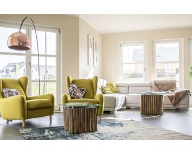 /Terrassentürelemente geplant, die viel Licht ins Haus bringen. Auf 34 m² ist der offene Wohn-/Ess- und Kochbereich angelegt. Die Küche kann mit einer Kochinsel geplant werden.