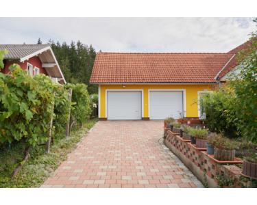Eine großzügige Doppelgarage mit drei elektrischen Toren ermöglicht bequemes Parken für mehrere Fahrzeuge und Durchfahrt in den Garten.