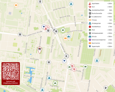Neben der verkehrstechnischen Lage überzeugt Gohlis-Nord mit einer umfassenden Nahversorgung. Zahlreiche Einkaufsmöglichkeiten, Cafés und Restaurants liegen in der direkten Umgebung, ebenso Schulen, Kitas und medizinische Einrichtungen. Grünflächen wie der Arthur-Bretschneider-Park oder der nahe gelegene Leipziger Auenwald laden zum Verweilen ein und unterstreichen die hohe Wohnqualität des Viertels.