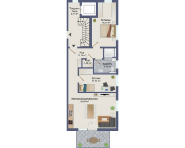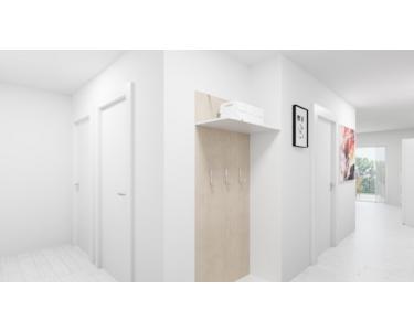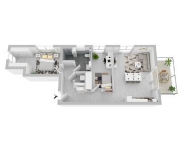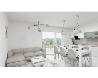 Der offene Wohn-, Koch- und Essbereich geht direkt in den Balkonbereich über, der eine harmonische Verbindung zwischen den Innenräumen und dem Außenbereich schafft. Der Balkon lädt dazu ein, die Zeit im Freien zu genießen. Das Schlafzimmer bietet einen ruhigen Rückzugsort, während das zusätzliche Zimmer flexibel als Kinder-, Arbeits- oder Gästezimmer genutzt werden kann.