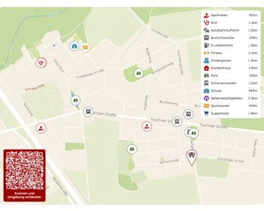 Einkaufsmöglichkeiten für den täglichen Bedarf sowie eine Apotheke sind nur wenige hundert Meter entfernt. Auch die Grundschule Portitz liegt nah und ist in rund fünf Autominuten erreichbar. Absolut ideal für Familien mit Kindern.