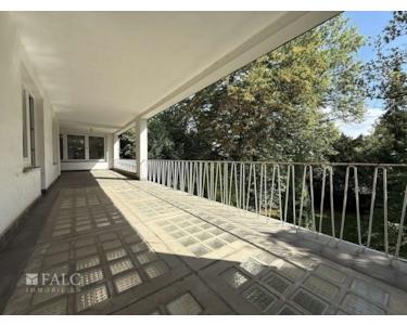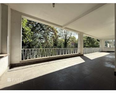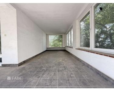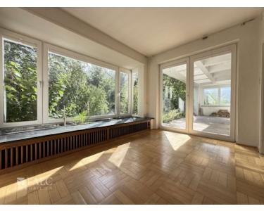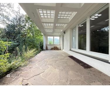 Architektonisch besticht das Gebäude durch seine offene und lichtdurchflutete Gestaltung. Großzügige Fensterfronten lassen viel Tageslicht herein und schaffen ein freundliches Wohn- und Arbeitsambiente. Im Obergeschoss lädt eine umlaufende Loggia zu entspannten Stunden im Freien ein, während sich im Erdgeschoss eine überdachte Terrasse, direkt unterhalb der Loggia, befindet. Ein besonders hervorzuhebendes Element ist der große Saal im Erdgeschoss, der mit einem Kamin und einem Wintergarten mit direktem Zugang zur Terrasse und dem Garten ausgestattet ist und damit eine eindrucksvolle Atmosphäre für private wie auch repräsentative Anlässe bietet.