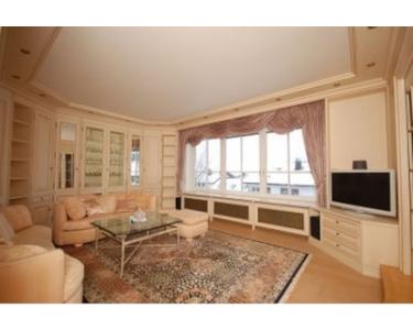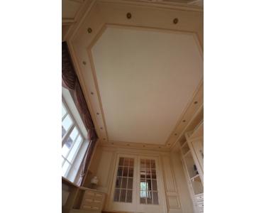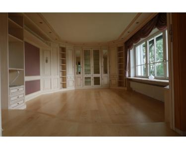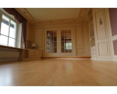 Das Wohnzimmer ist komplett im sogenannten klssischen Stil eingebaut mit Möbeln, die speziell für diesen Raum hergestellt wurden. Die Fronten sind in Rahmen-Füllung mit einer Strichlack Oberfläche und mit feinen mit Blattgold belegten Stäbchen ausgeführt. Die handgespachtelte Decke ist ringsum umrandet mit einem mehrfach profilierten Deckenanschlussprofil mit eingebauten Deckenstrahlern. Der Boden des Wohnzimmers ist mit Ahorn Parkett ausgestattet.