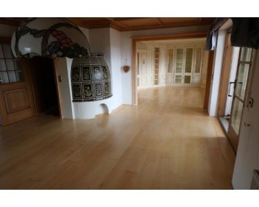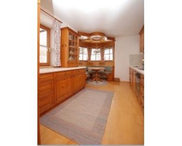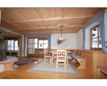 Die Möblierung im Esszimmer besteht aus einer von einem Schreiner eingebauten Eckbank aus massiver Fichte mit Tisch und 4 Stühlen, einer Eckvitrine und einer Ofenbank. Die Oberflächen sind aus natürlicher Fichte gebeizt und matt lackiert. Ein schöner Kachelofen auf der gegenüberliegenden Seite mit handgemalten Verzierungen sorgt für gemütliche Wärme. Der Kachelofen wird vom Keller aus beheizt. Ergänzt wird die Stube durch eine aufwändig gearbeitete Kassettendecke ebenfalls als Schreinerausführung in Fichte.
