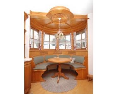 Die Einbauküche mit Essplatz im Runderker ist nach Maß von einem Schreiner hergestellt und eingebaut. Die Holzart ist Weymouthskiefer natur lackiert. Die Fronten sind in Rahmen-Füllung und eigens ausgesuchtem Holzbild hergestellt. Die Arbeitsplatte besteht aus Marmor Naturstein. Der Esserker mit Rundbank und rundem Tisch ist ebenfalls aus Weymuthskiefer hergestellt. Zusammen mit der Holzdecke, den mit Kannelüren versehenen Stollen mit geschnitzten Aufsätzen, der geschnitzten Rosette ist der Esserker ein einzigartiges Ensemble.