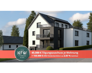 Je Wohnung ist ein zinsgünstiges KfW-Darlehen in Höhe von 150.000 € zu 2,03 % gesichert. Zusätzlich erhält jede Einheit einen Tilgungszuschuss von 45.000 €. Für Eigennutzer können darüber hinaus – vorbehaltlich Verfügbarkeit – weitere Fördermittel von bis zu 150.000 € beantragt werden. Dank dieser Konditionen sowie der überdurchschnittlichen Ausstattung bietet sich Ihnen ein außergewöhnliches Immobilienangebot mit hervorragendem Preis-Leistungs-Verhältnis.