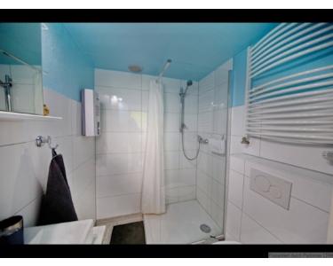 Das Badezimmer besteht aus einer Dusche mit Glastrennwand, einem WC, einem Waschbecken mit Spiegelschrank und Unterschrank sowie einer Handtuchheizung. Diele mit Schuhschrank.