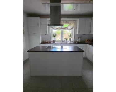 Die stilvolle Küche liegt mit der großen Kochinsel voll im Trend und bietet viel Stauraum und Arbeitsfläche.