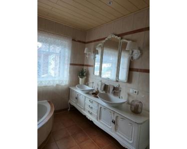 Ein Badezimmer mit Doppelwaschbecken, Badewanne und Dusche, sowie ein Gäste-WC runden das Erdgeschoss ab.