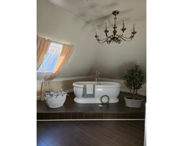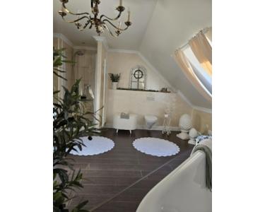Das große Badezimmer ist mit der freistehenden Badewanne ein optisches Highlight und bietet ein luxuriöses Badeerlebnis.