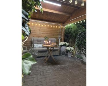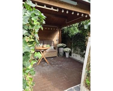 Die idyllische Gartenhausterasse versprüht den Hauch einer Oase und lädt zum Entspannen und Zusammensein ein.