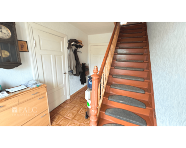 Im Erdgeschoss erwartet Sie eine großzügige Raumaufteilung. Die Küche, die ohne Möbel übergeben wird, bietet viel Platz und ist direkt mit einem sehr großen Badezimmer mit Fenster verbunden. Von hier aus gelangt man zudem über einen hinteren Ausgang in den Garten. Das Erdgeschoss verfügt außerdem über ein äußerst geräumiges Wohnzimmer sowie über ein weiteres großes Zimmer, das flexibel als Esszimmer, Arbeitszimmer oder Gästezimmer genutzt werden kann. Im Eingangsbereich führt eine Holztreppe in das Obergeschoss.