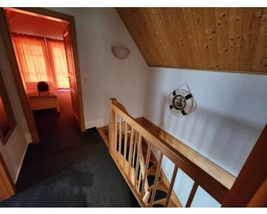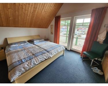 Im Erdgeschoss befindet sich der offene Wohnbereich mit Ofen, Küche, Gäste-WC Essbereich im Erker, Garderobe und Aufgang zum Obergeschoss, in dem sich zwei Schlafräume und das Badezimmer mit Dusche und Wasseranschluss für die Waschmaschine befinden, die sehr gut belichtet sind. Durch die Süd- Ostausrichtung blicken Sie auf die Wasserfläche der Hafenanlage, welches durch die teilweise vorhandenen bodentiefen Fenster noch begünstigt wird.