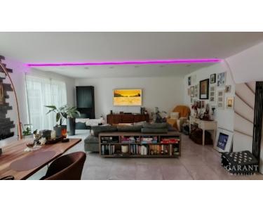 Erdgeschoss (ca. 146 qm): Offener Wohn- und Essbereich mit moderner Küche und Kochinsel, Schlafzimmer, Kinderzimmer, Gäste-WC, Bad mit Dusche, Bidet und Whirlpool, großzügige Terrassen mit direktem Gartenzugang.