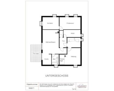 Untergeschoss (ca. 70 qm): Separate Wohneinheit mit Wohn- und Essbereich, offener Küche, Schlafzimmer, Proberaum, Bad mit Dusche und WC, Terrasse sowie Holzofen. Zudem Kellerabteil, Heizungsraum und Waschküche.