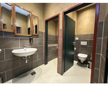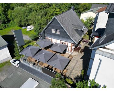 Das Obergeschoss verfügt aufgrund der Hanglage ebenfalls über einen ebenerdigen Zugang von der Jägerstraße aus. Hier liegt ein weiterer großer Gastraum mit eigener Theke sowie ein überdachter Balkon, der einen herrlichen Ausblick auf den Arnsberger Wald und die Kreuzkapelle bietet. Die angrenzende Außengastronomie umfasst rund 54 Sitzplätze und sorgt für zusätzliche Attraktivität.