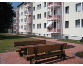 Die Wohnung liegt in einem Mehrfamilienhaus mit 6 Eingängen und 4 Etagen. 2 Mehrfamilienhäuser bilden eine Neubausiedlung mit 76 Wohnungen und 56 Parkplätzen.