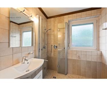 - Tageslichtbad Erdgeschoss: Waschbecken, bodentiefe Dusche, WC