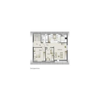 Die Dachgeschoss-Einheit ist auf ca. 63 m² ebenfalls mit drei Zimmern, einem offenen Essbereich, Küche und einem Tageslichtbad ausgestattet.