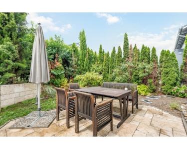 Vom Wohnbereich aus gelangt man direkt auf die große Terrasse mit Blick auf den liebevoll angelegten Garten und einen kleinen Teich – ein echtes Highlight für Gartenliebhaber.