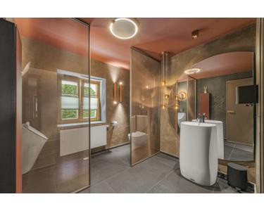- großformatige Fliesen im Badezimmer sowie Designer Ausstattung
