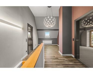 Im Obergeschoss befinden sich zwei Schlafzimmer sowie ein ca. 6 m² großer Balkon in östlicher Ausrichtung. Dank einer vollständigen Netzwerkverkabelung eignet sich der Flur hervorragend als Arbeitsplatz.