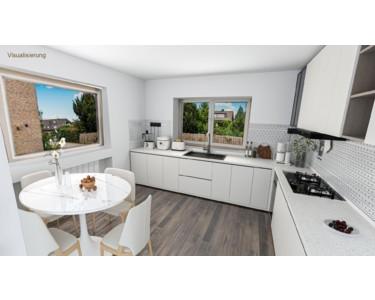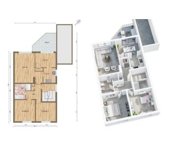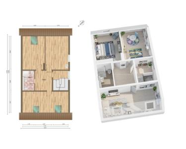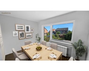Das Obergeschoss bietet eine geräumige Diele, die die verschiedenen Räume verbindet. Es gibt zwei Schlafzimmer, von denen eines als Hauptschlafzimmer genutzt werden kann. Das zweite Zimmer eignet sich als Kinderzimmer, Arbeitszimmer oder Gästezimmer. Die kompakte Küche bietet ausreichend Platz für moderne Haushaltsgeräte und ist durch einen Durchgang mit dem Esszimmer verbunden. Von hieraus gelangen Sie auf die sonnige Balkonterrasse, die mit ihrer großen Fläche (ca. 14qm²) viele Möglichkeiten für entspannte Stunden im Freien bietet – ob als gemütliche Sitzecke, Grillplatz oder grüne Oase. Das Badezimmer ist groß und geräumig, ausgestattet mit Dusche und Badewanne, WC und Anschluss für Waschmaschine oder Ähnliches.