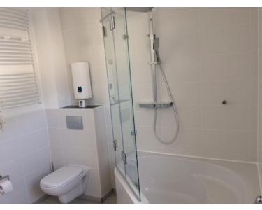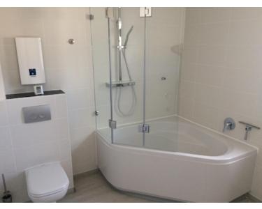 Das Bad ist weiß gefliest, mit Eckbadewanne und Duschabtrennung sowie Anschlüssen für Waschmaschine und Trockner. Waschtisch, Spiegel, Armaturen etc. sind bereits montiert.