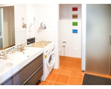 - Bad mit Doppelwaschbecken, bodentiefer Dusche mit Glastür und abgetrenntem WC