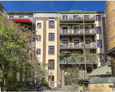 Ein besonderes Highlight ist der großzügige Süd-Balkon, der vom Wohnbereich aus erreichbar ist. Mit 2021 erneuerten Holzdielen und einem großen Sonnensegel, können Sie hier traumhafte Stunden im Sommer verbringen. Von hier aus genießen Sie auch einen traumhaften Blick in den idyllischen Innenhof, auf die neben dem Haus liegende & stillgelegte Kirche und auf ein märchenhaftes Kutscherhaus.