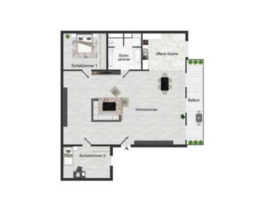 Vom Wohnbereich aus gelangen Sie in die beiden Schlafzimmer sowie in das Badezimmer. Dieses überzeugt mit einer Wanne, einem Doppelwaschbecken, einer separaten und ebenerdigen Dusche mit Glastür sowie einem praktischen, abgetrennten WC.