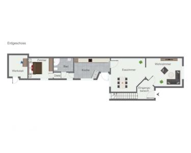 Im Anschluss befindet sich das gemütliche Wohnzimmer, ein separates Esszimmer, eine funktionale Küche sowie ein Bad mit Dusche.