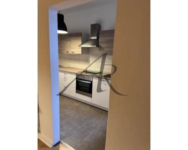 Wohnzimmer mit Zugang zum Balkon und Küche