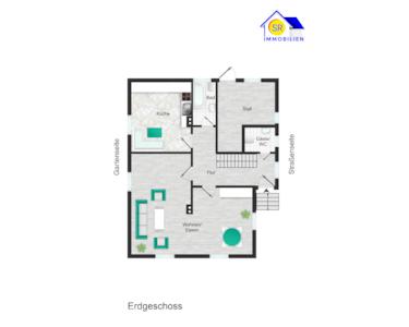 Über einen Vorbau betreten Sie das Haus, von hier aus erreichen Sie über den zentralen Hausflurbereich alle Räume, auch das Gäste-WC (inkl. Waschmaschinenanschluss). Die durchdachte Raumaufteilung mit angenehm großen Räumen lässt keine Wünsche offen. Das helle Wohnzimmer mit über Eck angeschlossenem Esszimmer bietet viel Platz für gemütliche Stunden. Die großzügige Küche mit Einbauküche und Platz für eine Familiensitzecke öffnet sich direkt zum Garten. Das kleine Badezimmer mit Badewanne vervollständigt das Raumangebot im Erdgeschoss.