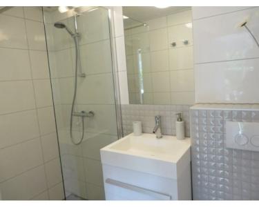 Geräumiges und praktisches Badezimmer im Erdgeschoss mit Fußbodenheizung, ausgestattet mit einer ebenerdigen Dusche, einem Waschbecken mit modernem Badmöbel und dazugehörigem Spiegel sowie einem Wand-WC. Die Raumaufteilung ist funktional und bietet komfortable Annehmlichkeiten für den täglichen Gebrauch.