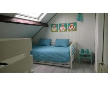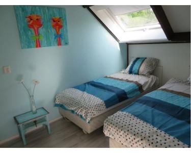 Eine Holztreppe führt ins Obergeschoss, wo sich dieses Schlafzimmer von ca. 10 m² befindet. Das Zimmer ist mit zwei großen Einzelbetten (90 cm x 200 cm) eingerichtet und verfügt über einen Schrank für zusätzlichen Stauraum. Der Raum ist funktional gestaltet und bietet komfortable Schlafmöglichkeiten für zwei Personen.