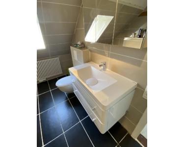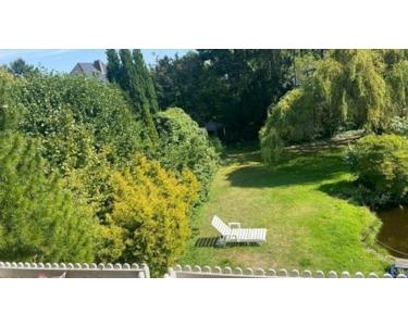 Im Obergeschoss befindet sich eine drei Zimmerwohnung, welche über einen gemeinsamen Hauseingang betreten werden kann. Idealerweise ist das Erdgeschoss durch eine Zwischentür abtrennbar, so dass die Wohnung im Obergeschoss untervermietet werden könnte und sich damit viel Spielraum für Wohnkonzepte ergibt. In unserem Fall bewohnten unsere Kinder die obere Etage. Die überdachte Balkonfront mit Blick in den hinteren Teil des Gartens lädt zum Verweilen ein. Die obere Etage verfügt über kleine Küchenzeile, Bad (Ohne Badewanne) und einem großem Wohnzimmer sowie zwei Schlafzimmer.