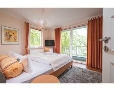 Das Hauptschlafzimmer bietet ein gemütliches Doppelbett, einen modernen Kleiderschrank und Zugang zum Balkon – damit Du den ersten Kaffee gleich mit Meeresluft genießen kannst.