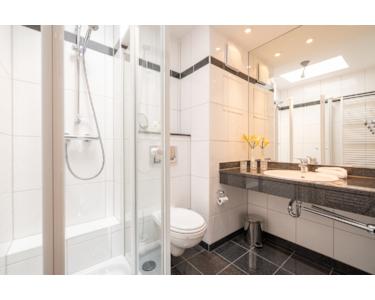Das Badezimmer ist modern gestaltet, mit Dusche, WC und einer Lichtkuppel, die für natürliches Tageslicht sorgt.