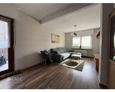 Der Wohnbereich ist großzügig gestaltet und durch die großen Fenster fällt viel Tageslicht herein, was eine warme und einladende Atmosphäre schafft. Von hier aus gelangen Sie auf die Terrasse, die einen schönen Blick auf den Garten bietet und ideal für entspannte Stunden im Freien ist.