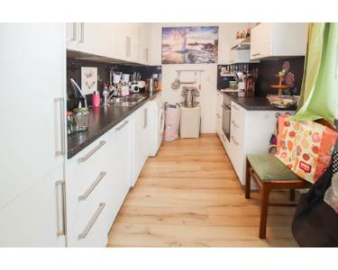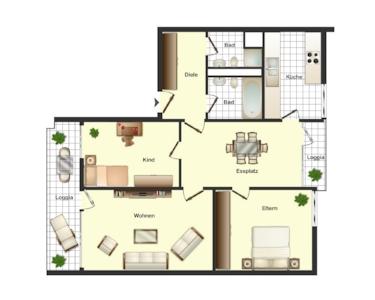 Mittelpunkt der Wohnung ist der große Essbereich – von hier aus sind alle Räume erreichbar. Zwei Bäder sorgen für angenehmen Wohnkomfort und lassen morgendliche Wartezeiten der Vergangenheit angehören. Küche und zwei Schlafräume ergänzen das Raumangebot.