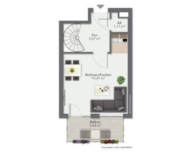 Im 3. OG befindet sich das Wohn- und Esszimmer mit Pantryküche und ein Abstellraum. Die beiden Etagen sind über eine Wendeltreppe miteinander verbunden.