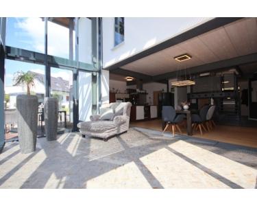 Ein besonderes Highlight ist der zweigeschossige Wintergarten mit offenem Luftraum, der sich über beide Etagen erstreckt und durch seine beeindruckende Glasfront für ein außergewöhnliches Raumgefühl sorgt.