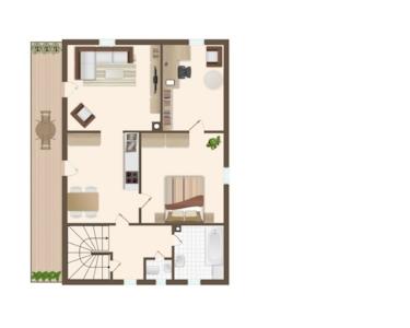 Das Haus bietet auf zwei Etagen jeweils eine Wohnung mit identischem Grundriss. In jeder Einheit befinden sich eine Küche, ein Wohnzimmer, ein Schlafzimmer, ein weiteres Zimmer, das sich gut als Büro oder Kinderzimmer eignet, sowie ein Badezimmer und ein separates WC. Im Obergeschoss steht zusätzlich ein Balkon zur Verfügung, der sowohl von der Küche als auch vom Wohnzimmer aus begehbar ist. Die Raumaufteilung ist funktional und ermöglicht angenehmes Wohnen mit ausreichend Platz für Paare oder kleine Familien.