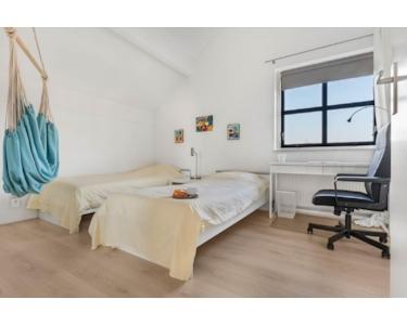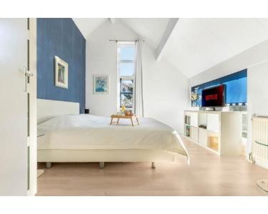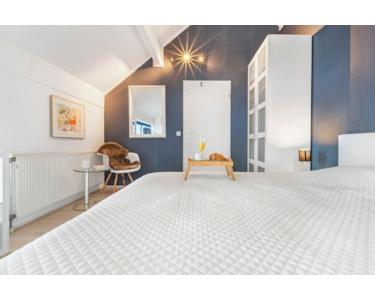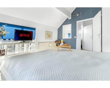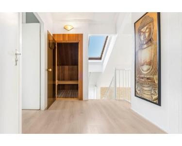 Erster Stock: Die obere Etage bietet einen Treppenabsatz mit offenem Giebel und zwei große Schlafzimmer. Das Hauptschlafzimmer hat TV und eine sehr schöne Verglasung mit Gartenblick. In dem zweiten Schlafzimmer befinden sich 2 Einzelbetten und ein Arbeitsplatz. Darüber hinaus finden Sie eine große Sauna mit Liegebereich und Dachfenster mit Dünenblick. Außerdem ein zweites Badezimmer mit ebenerdiger Dusche und Waschbecken, mit Fenster. Die Zentralheizung (Gas) und die mechanische Abluftanlage sorgen für ein optimales Raumklima.