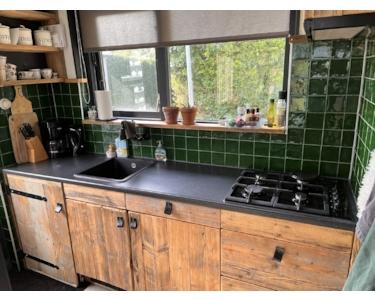 In der gemütlichen, stimmungsvollen Küche können Sie mit grünem Blick auf die Rückseite kochen.